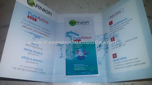 Nella foto il campioncino Garnier Pure Active ricevuto da Marina. Si tratta di un prodotto 3 in 1: detergente, scrub ...