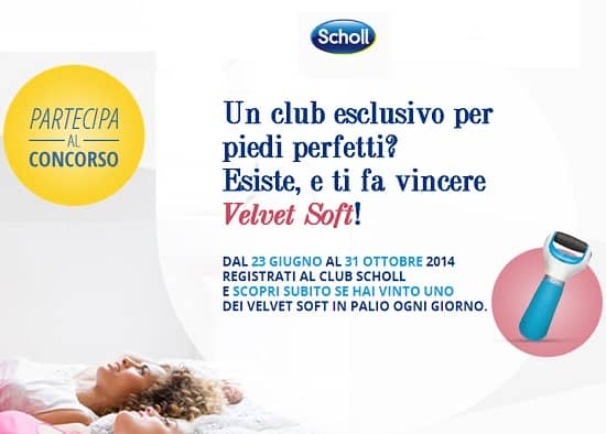 Concorso a Premi Velvet Soft Scholl valido fino al 31/10/2014 con estrazione finale entro il 07/11/2014. In palio 131 Scholl Velvet Soft ...