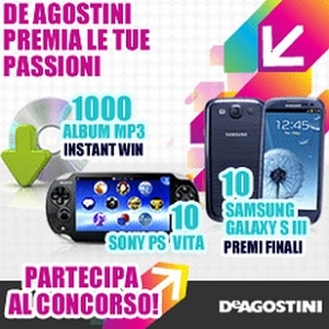 Concorso Instant Win De Agostini Passion che mette in palio 1000 album MP3 con INSTANT WIN e come Super Premo Finale 10 Sony PS Vita e 10 Samsung Galaxy S III per un totale di oltre 16.000 Euro + IVA Dopo aver inserito i vostri dati dovete cliccare sul link che arriva via email per confermare l’iscrizione.