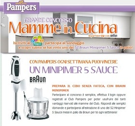 Concorso Pampers Mamme in Cucina che mette in palio 52 Braun Minipimer 5 Sauce del valore di 100 Euro cadauno per un montepremi totale di oltre 5000 Euro.