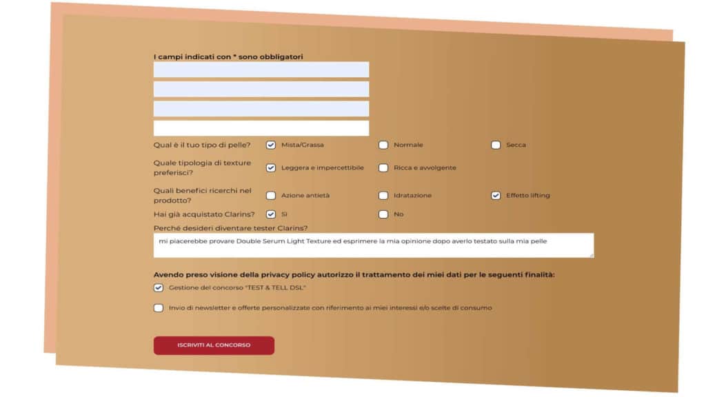 Per diventare tester Clarins e ricevere gratis il prodotto, devi visitare la pagina ufficiale della campagna sul sito Clarins seguendo il link che troverai continuando a leggere questo articolo, compilare un breve questionario ed il modulino con i dati per la spedizione in caso tu venga selezionata.