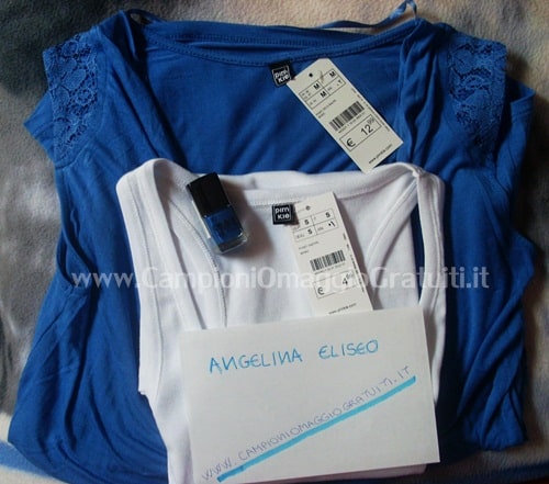 Nella foto ricevuta da Angelina potete vedere i due capi di abbigliamento e lo smalto acquistati da Pimkie con i ...